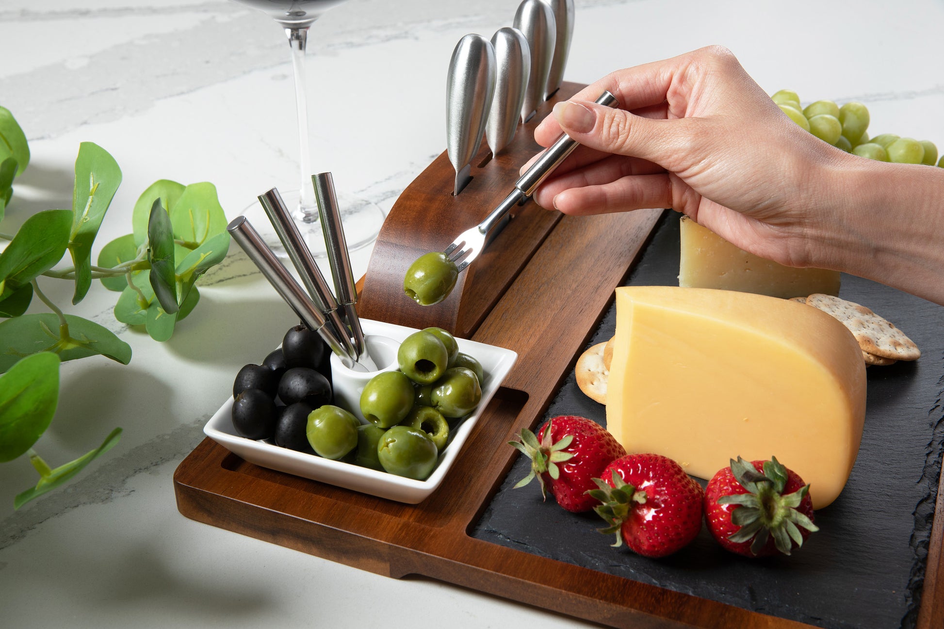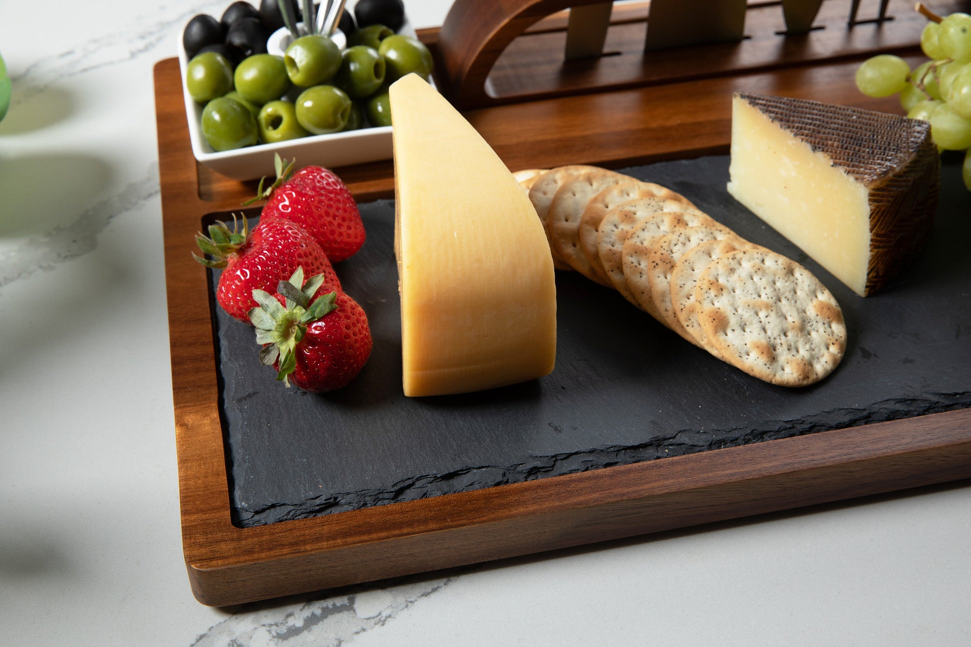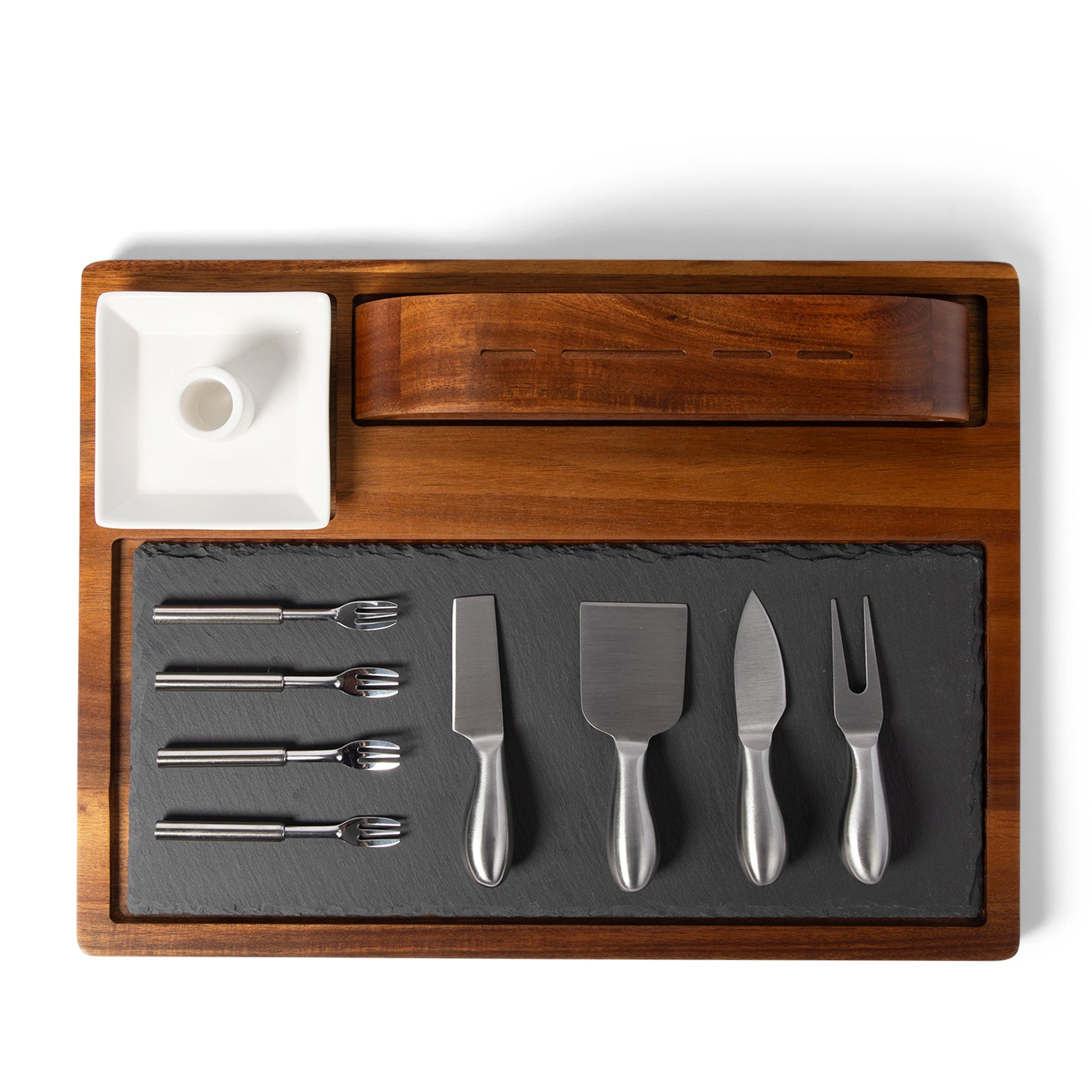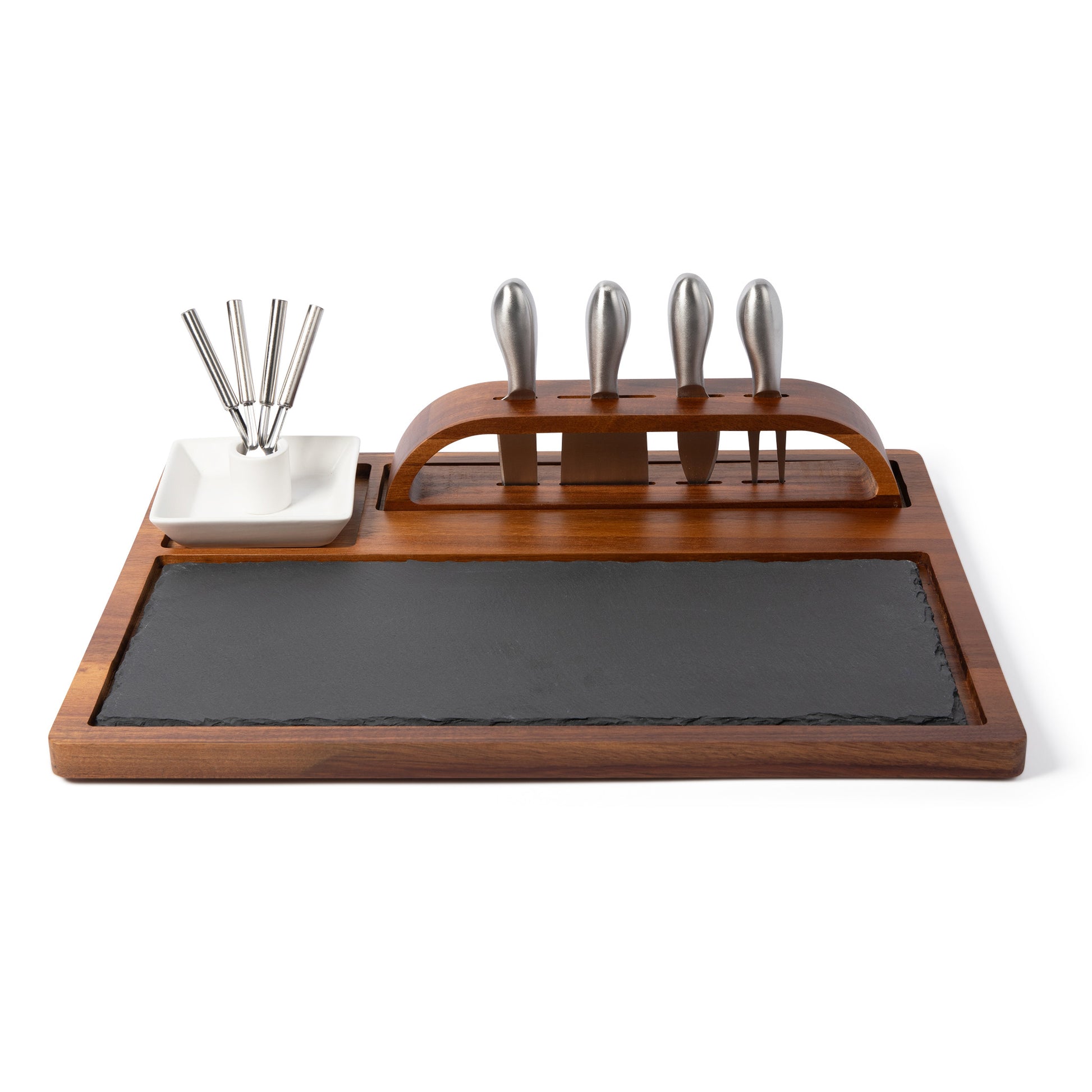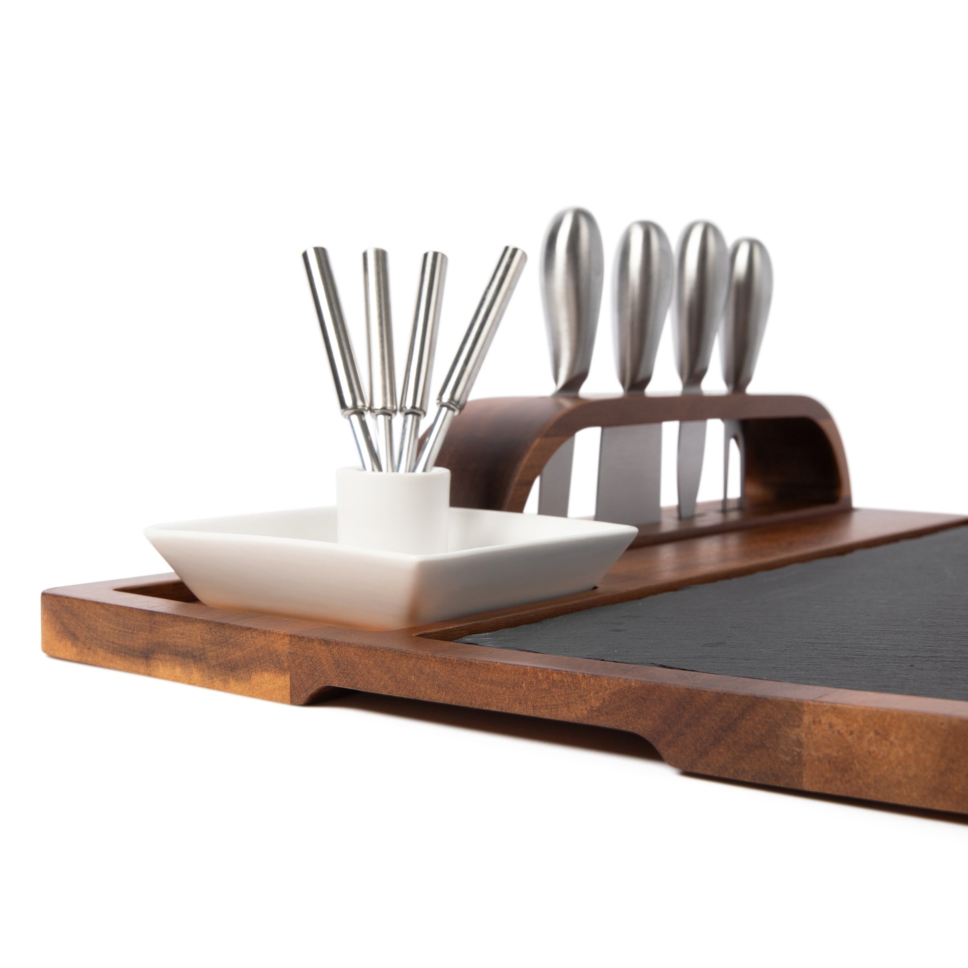 - The Charcuterie Board Set features acacia wood with a black slate tray.