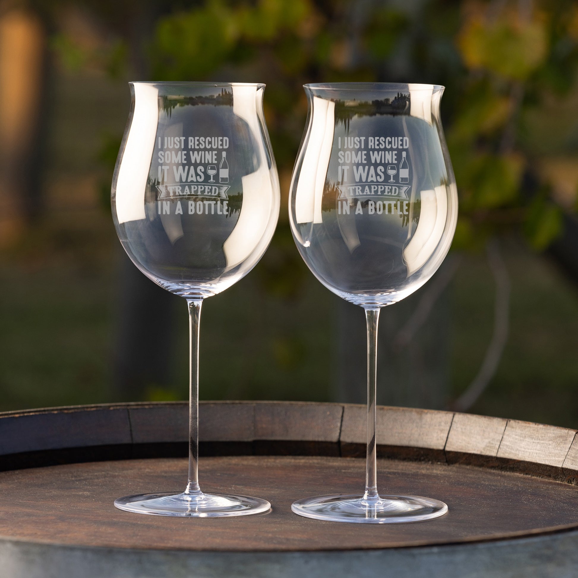 Etched with the playful line “I rescued some wine; it was trapped in a bottle,” this 34-ounce beauty proves that good deeds come in generous pours. With its graceful tulip bowl and flared lip, The Jeroboam brings out the earthy character of reds like Cab Franc or Pinotage — and doubles as the perfect Sangria glass when you’re feeling festive.