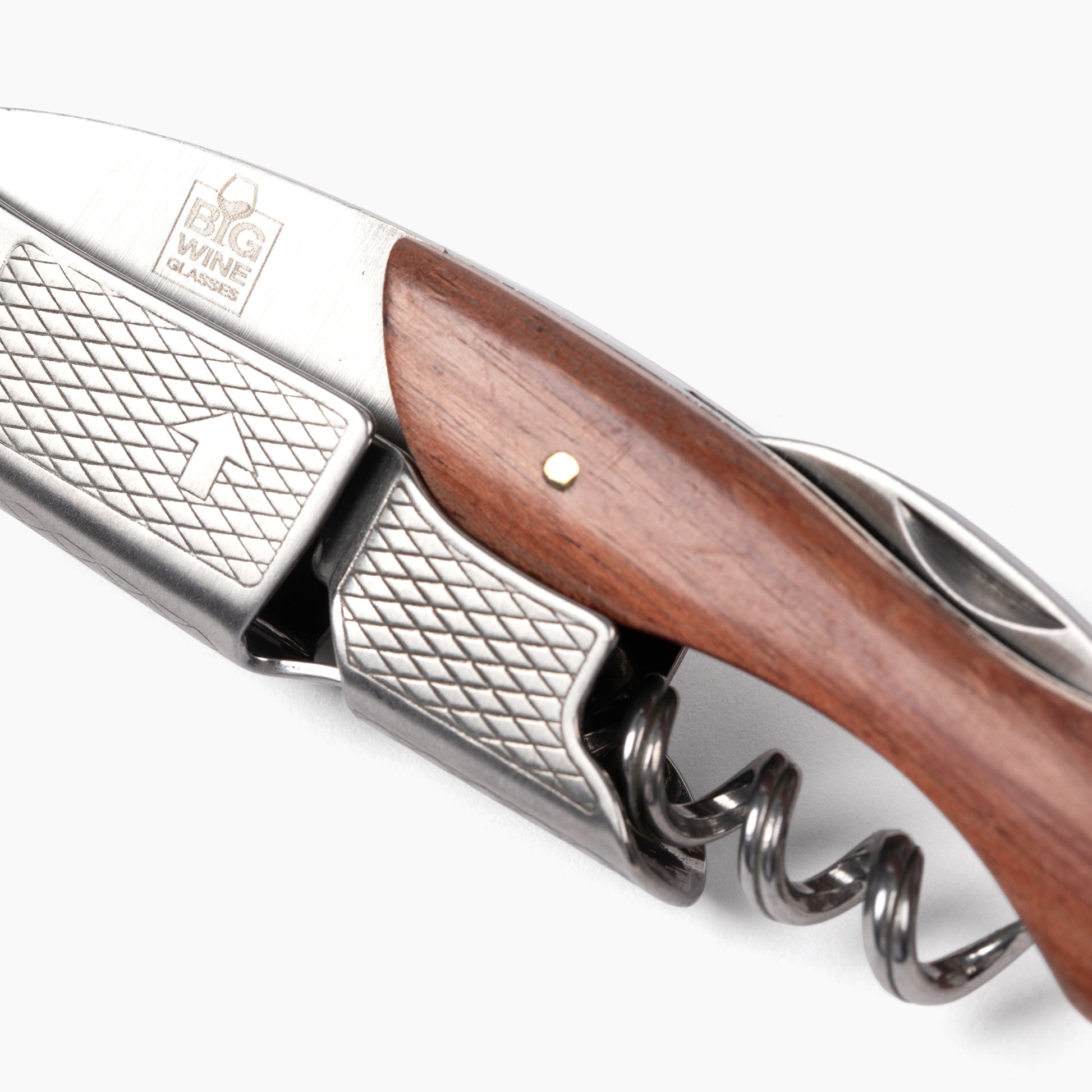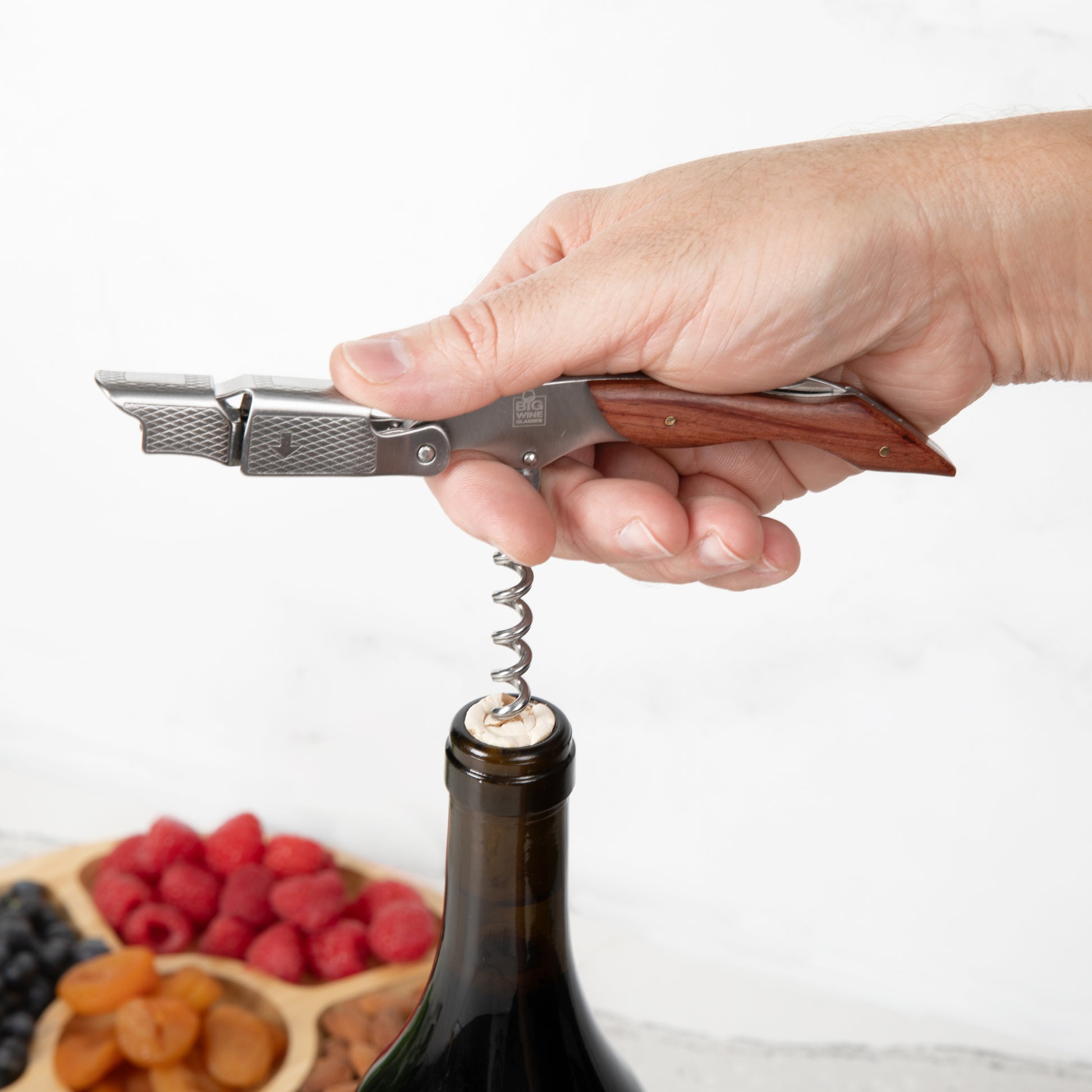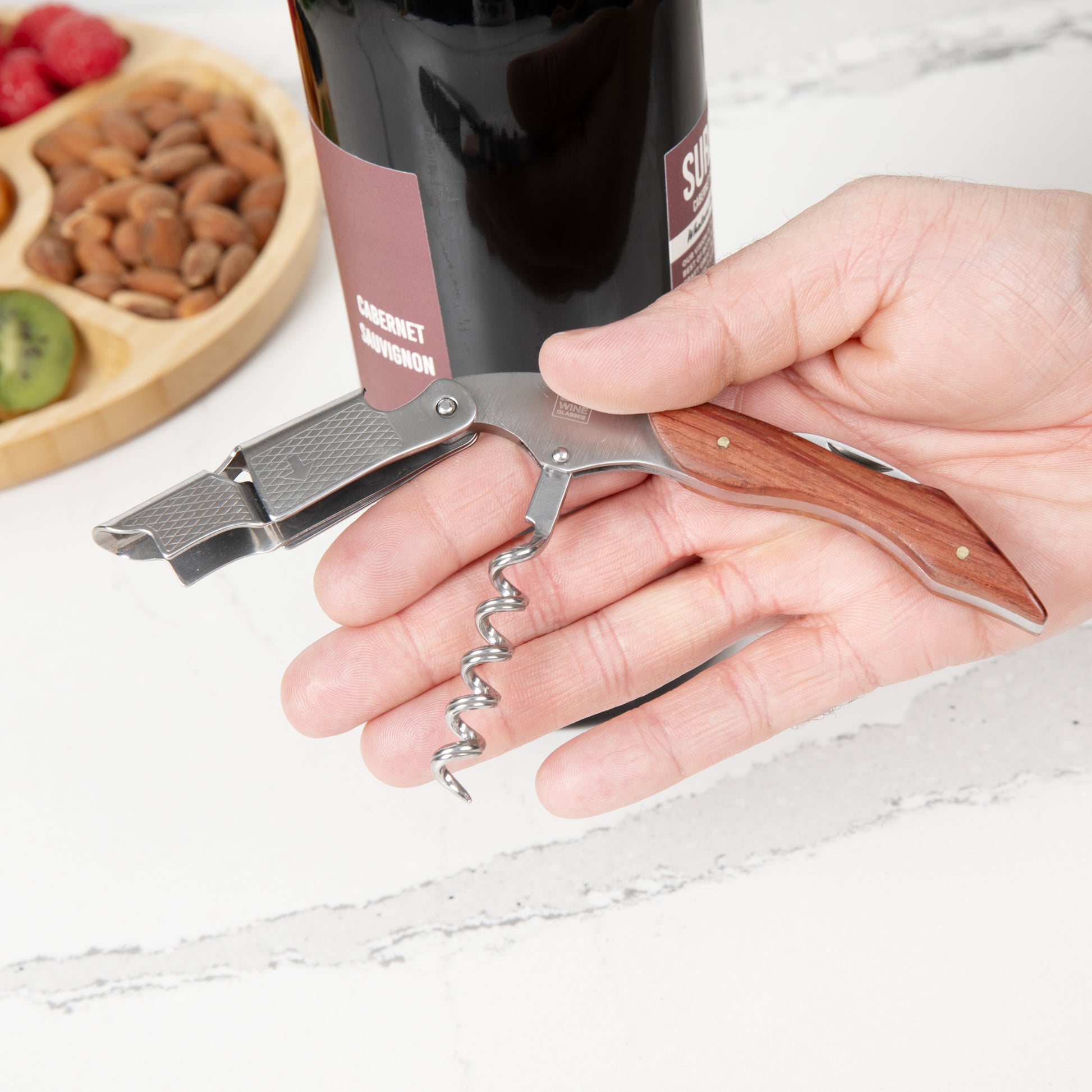 Trusted by experts, this premium corkscrew with a wine foil cutter is perfect for opening wine quickly and easily. Stop wrestling with electric openers that need to be charged and require an owner's manual to figure out! Open wine bottles like a pro with a couple of quick twists. The rosewood handle and stainless-steel body are crafted to give you control and accuracy. The sleek and compact design also makes it easy to carry wherever you go. This durable corkscrew will definitely be your go-to for countless bottles of wine!